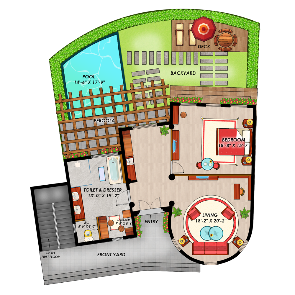 The Opulenz Ground Suite offers a Total Super Area of 4565 sq. ft., which includes both the personal usable area and common areas. It features a Carpet Area of 1106 sq. ft., a Built-up Area of 1274 sq. ft., and a Total Personal Usable Area of 2739 sq. ft., comprising the unit space along with a private front and backyard.